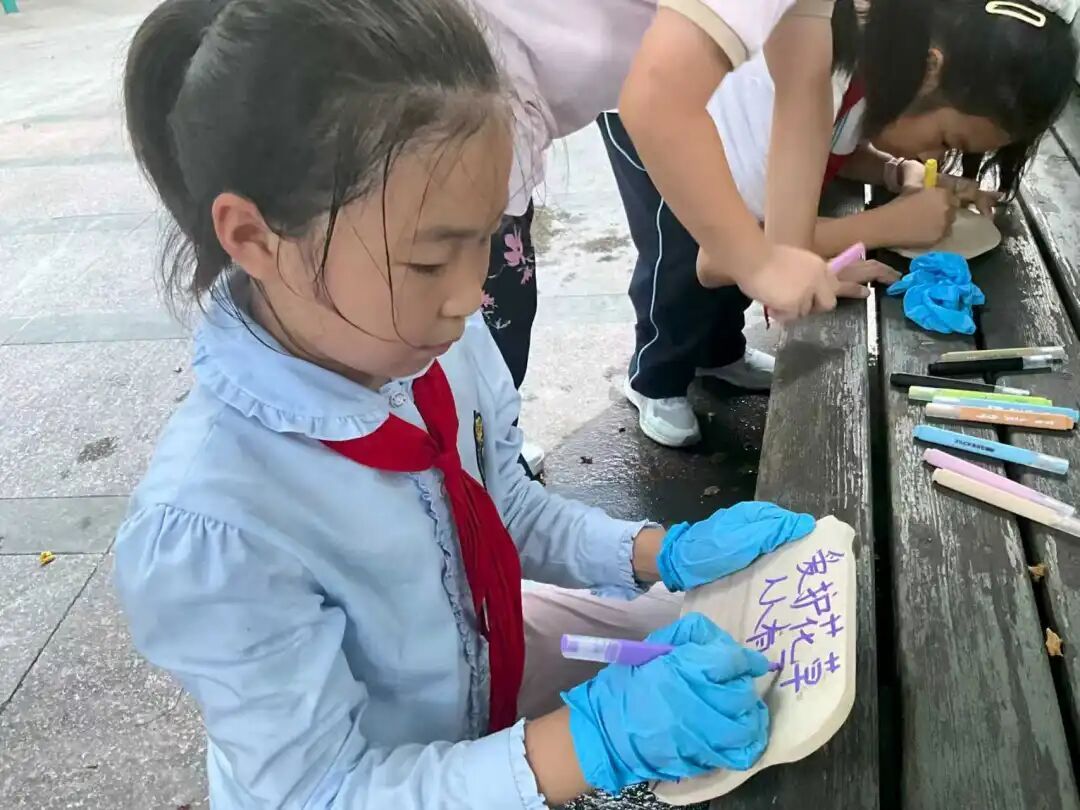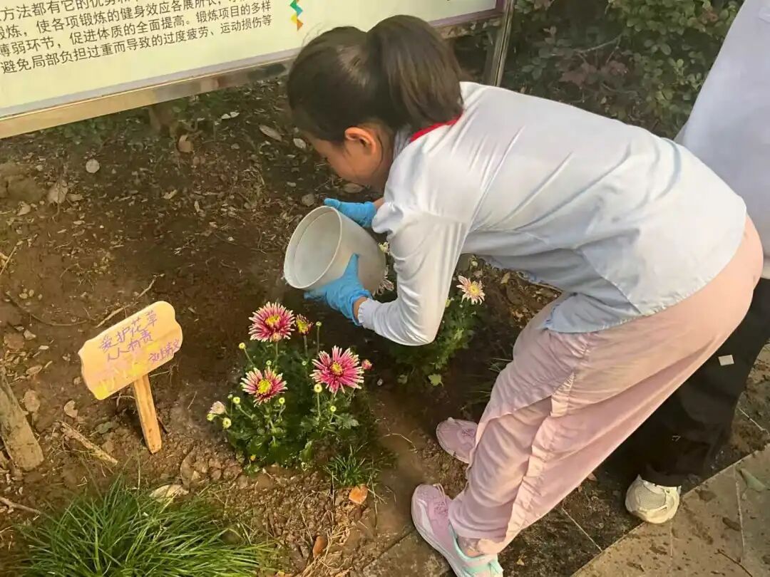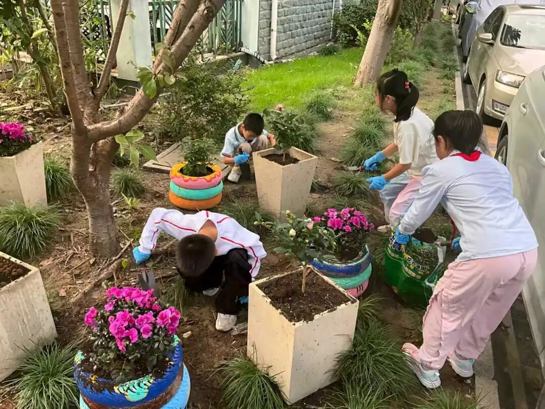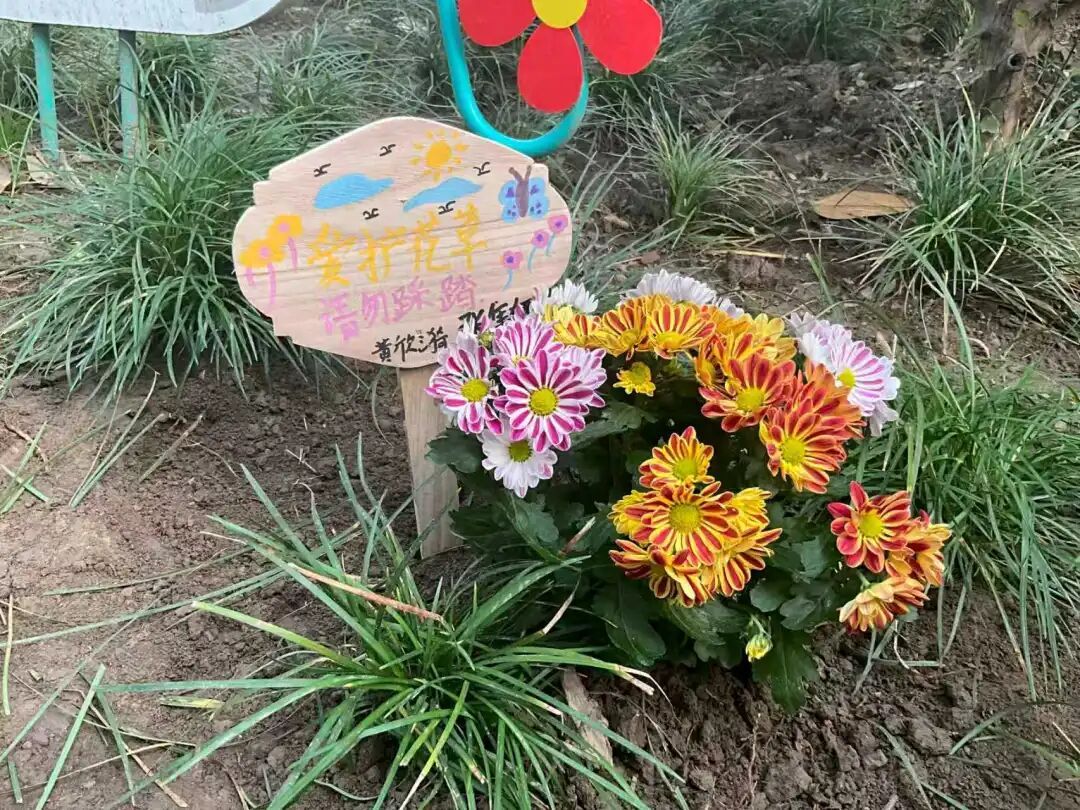 种植完成后,孩子们满怀珍视与期待,为新栽的花卉浇上第一遍水,并在专属认领牌上郑重写下承诺:“爱护花草,人人有责”“爱护花草,请勿踩踏”。这些稚嫩而真诚的话语,既是孩子们对自然的深情告白,也是他们主动承担社区“微治理”责任的生动体现。