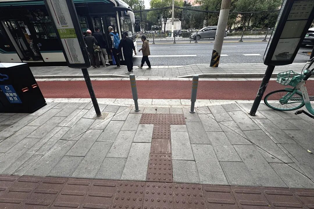 改造中最引人注目的是无障碍设施的完善。站台与人行道之间新增了人行横道线和缘石坡道,使得轮椅用户、推婴儿车的家长都能便捷通行。同时,盲道系统从人行道延伸至站台,长度与站台相匹配,为视障人士提供了清晰的触感指引。这些改动不仅提升了实用性,还让站台整体视觉更和谐。