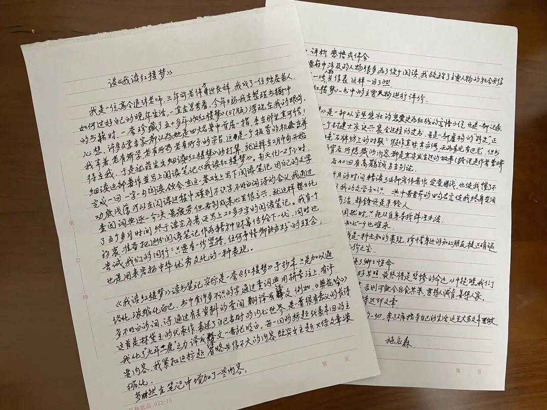历经5个多月,施应森终于读完原著。当他小心翼翼捧出一叠读书笔记时,记者第一反应是“意外”——厚约300页、用旧报纸分册装订得整整齐齐的信纸,每一页都写得满满当当,有的是对《红楼梦》人物的分析,有的是对情节的感悟,还有的是对书中诗词的解读。记者粗略估算了一下,约300页信纸,每页按700字算,也有20余万字。