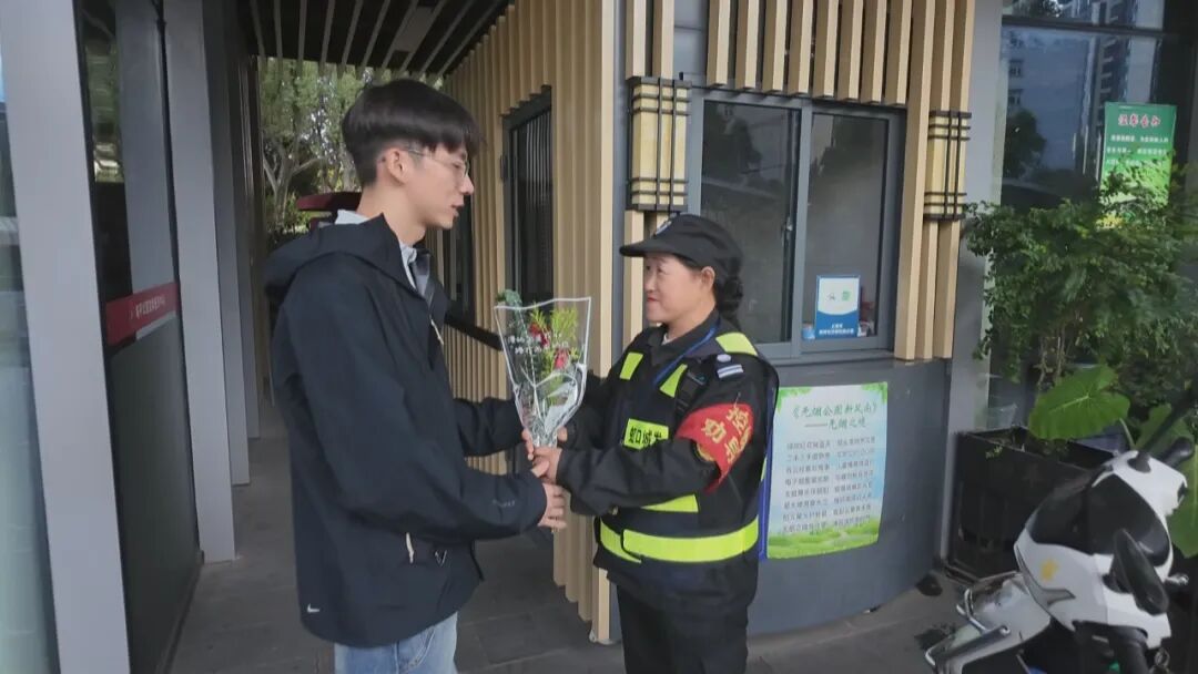 和平公园的保安何阿姨更是欣喜地表示:“像我们这个年龄好多年都没有收到花了,虽然天天在公园里上班,突然收到这个花心情是特别的好,特别不一样。”
