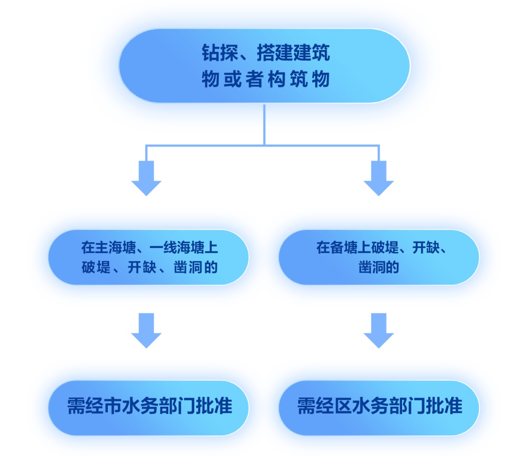 在海塘保护范围内从事下列行为,应当经区水务部门批准;但在主海塘、一线海塘上从事第一项行为涉及破堤、开缺、凿洞施工的,应当经市水务部门批准: