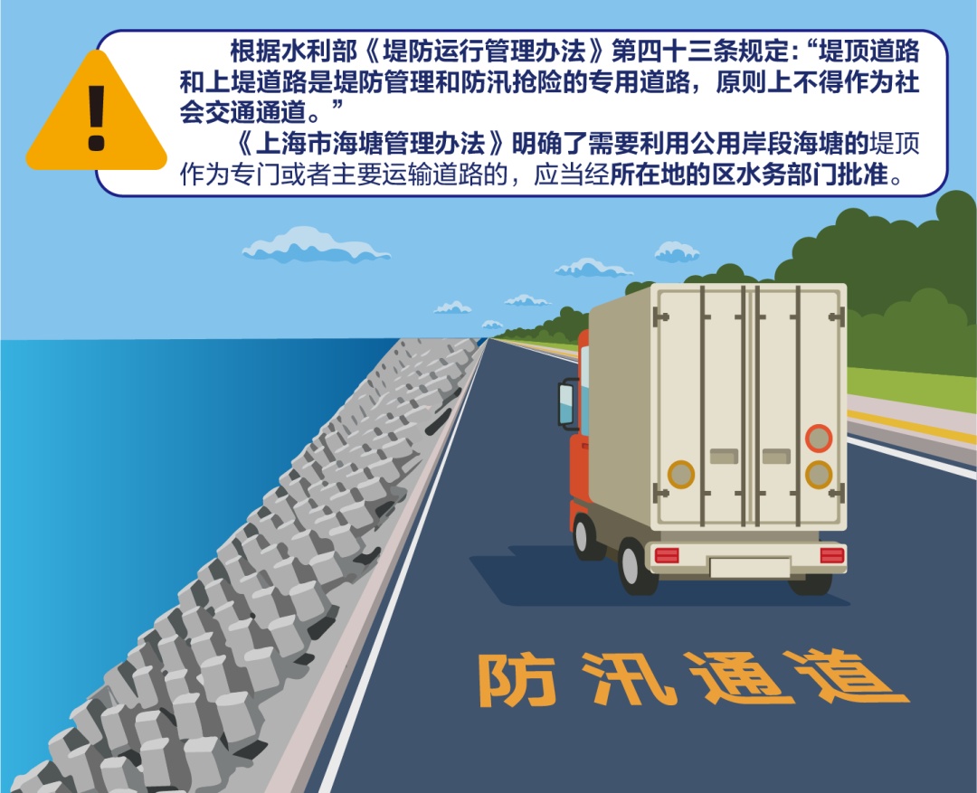 根据水利部《堤防运行管理办法》第四十三条规定:“堤顶道路和上堤道路是堤防管理和防汛抢险的专用道路,原则上不得作为社会交通通道。”