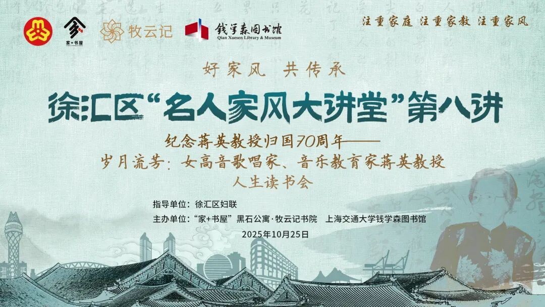 徐汇区“名人家风大讲堂”第八讲“岁月流芳:女高音歌唱家、音乐教育家蒋英教授”人生读书会,日前在徐汇家+书屋“牧云记”书店举行。 蒋英,这位在时代星空中散发着独特而耀眼光芒的杰出女性。少女时代,她在上海度过中学时光;学成归国,她在上海闪耀音乐舞台。她出身名门,却用艺术定义自我;她是科学家身边温柔的伴侣,更是中国声乐教育事业坚定的拓荒者。她的人生,是一首融汇了家国情怀、艺术追求与坚定爱情的壮丽乐章。