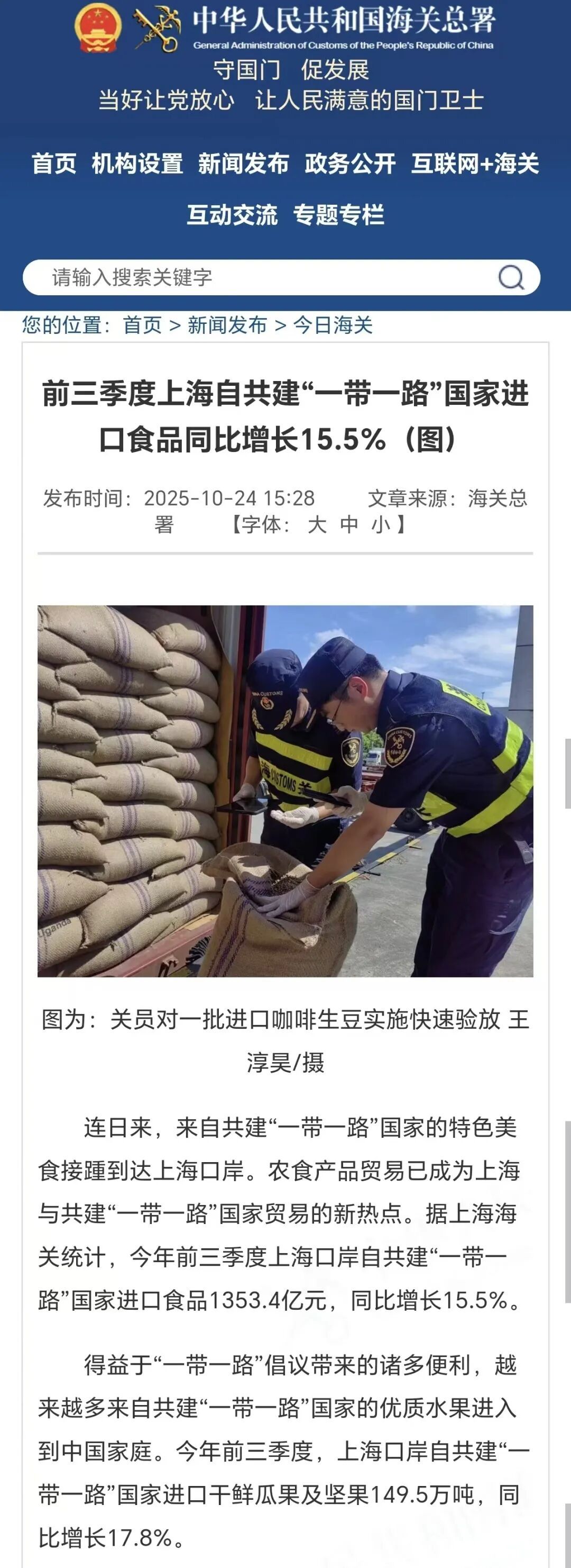 ●06 前三季度上海自共建“一带一路”国家进口食品同比增长15.5%(海关总署门户网站、中新社、上海法治报、新民晚报、上观新闻)