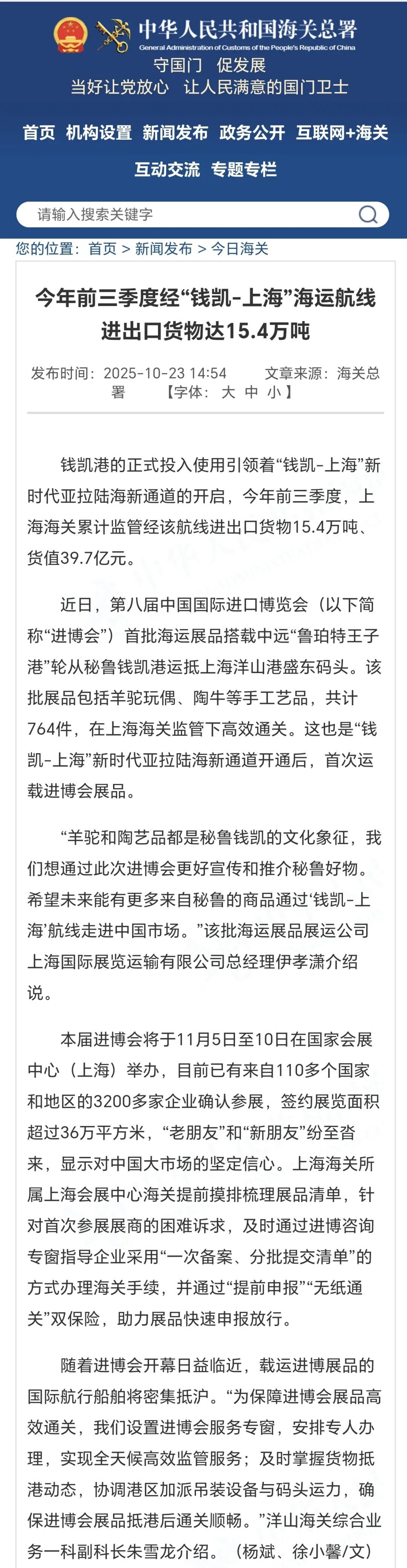 ●04 今年前三季度经“钱凯-上海”海运航线进出口货物达15.4万吨(央视《经济信息联播》《朝闻天下》《第一时间》、海关总署门户网站、中国国门时报、海关发布、新华财经、中新社、上观新闻)