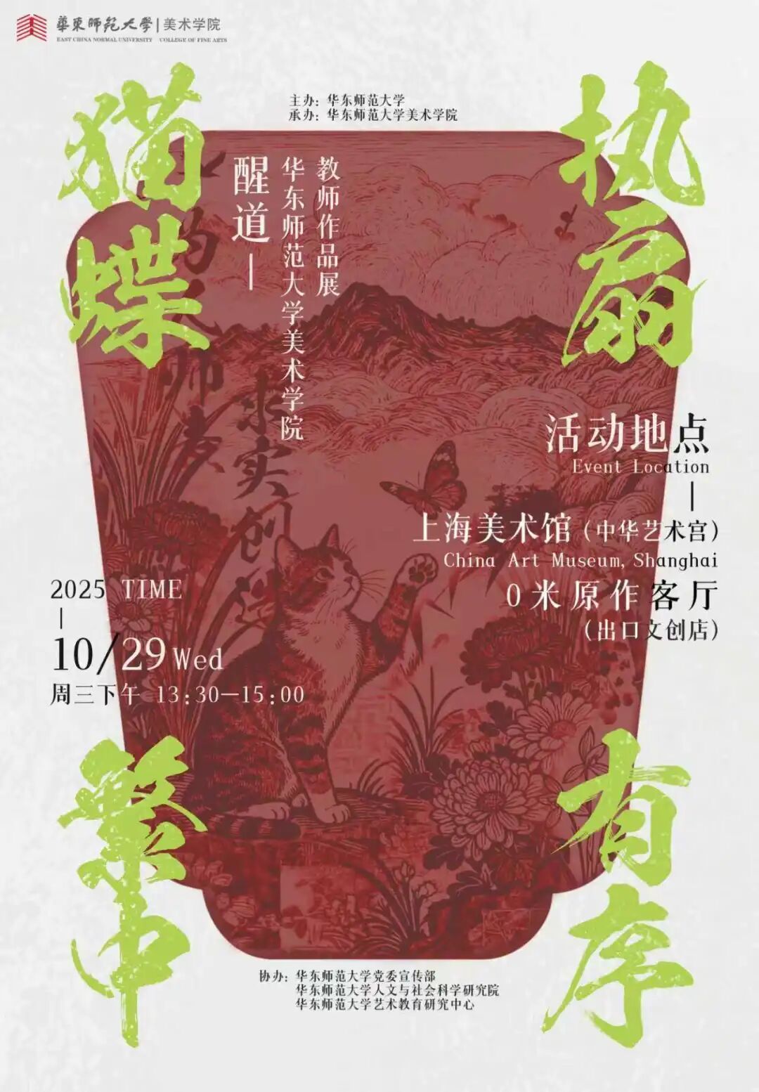 为弘扬中华美育精神,积极响应国家美育政策,全面贯彻落实新时代美育工作要求,“醒道——华东师范大学美术学院教师作品展”展览期间(10月24日-10月31日),上海美术馆与华东师范大学美术学院共同开展面向公众的公共教育活动,希望公众在参与中感悟中华优秀传统文化的深厚内涵,提升审美素养与文化自信。