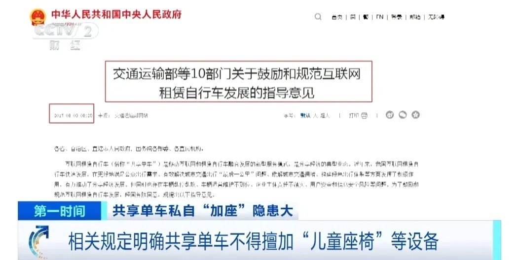 早在2017年,交通运输部等10部门就联合出台了《关于鼓励和规范互联网租赁自行车发展的指导意见》,规定用户不得违反规定载人,不得擅自加装儿童座椅等设备。