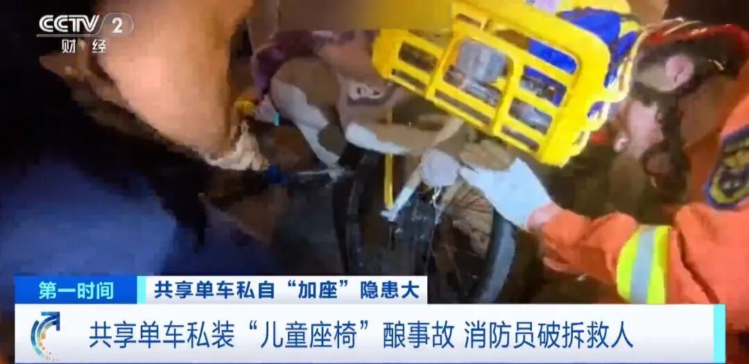 ■2025年7月,北京一男孩乘坐家长在共享单车上私装的儿童座椅木板,车转弯时,其左脚不慎被卷入前车轮中,最后消防人员对车轮实施破拆,救出了男孩。