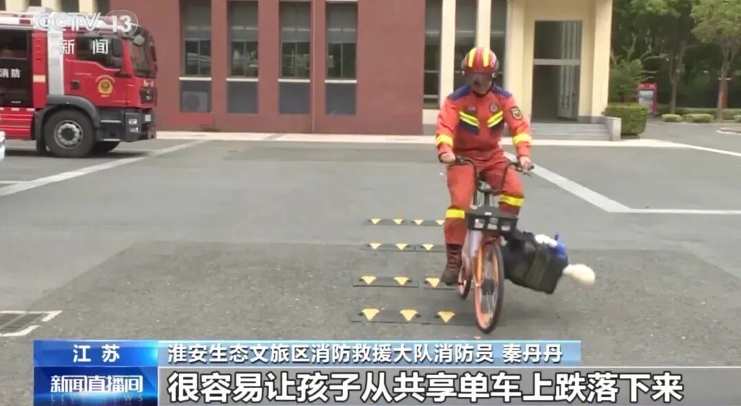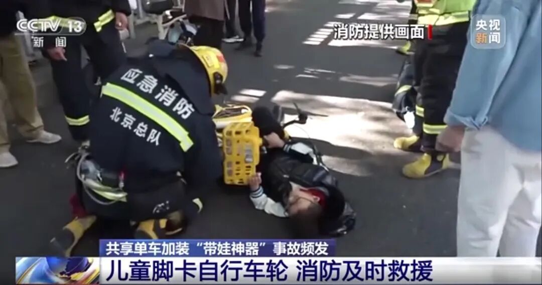 ■2024年5月,北京一4岁女童也是坐在共享单车前梁的“儿童座椅”上,右脚不慎被卡进了单车前轮中,最后消防人员通过破拆救出了女童。