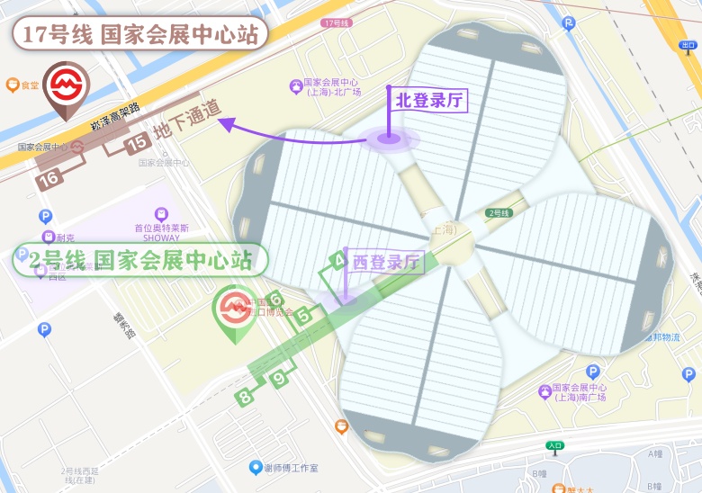 观众到达国家会展中心站后,可从15号口出,通过过街地道直通场馆北广场,从北登录厅入场。