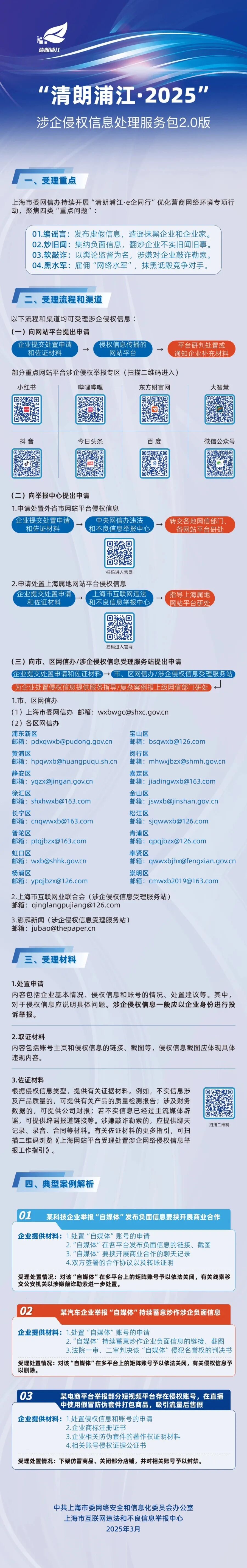 去年,市委网信办发布了《涉企侵权信息处理服务包1.0》,初步介绍了企业投诉举报侵权信息的流程和渠道,发布了典型案例解析。今年,涉企侵权信息处理服务包升级到2.0版(详见下方长图),将涉企侵权举报受理渠道划分为网站平台、举报中心、网信部门和涉企侵权服务站等类型,分类展示了流程图。针对企业提交举报投诉材料的盲点和误区,服务包2.0提供了针对性指导。