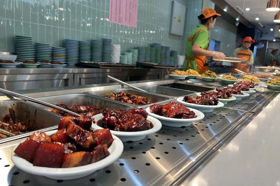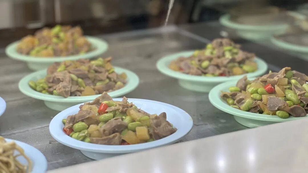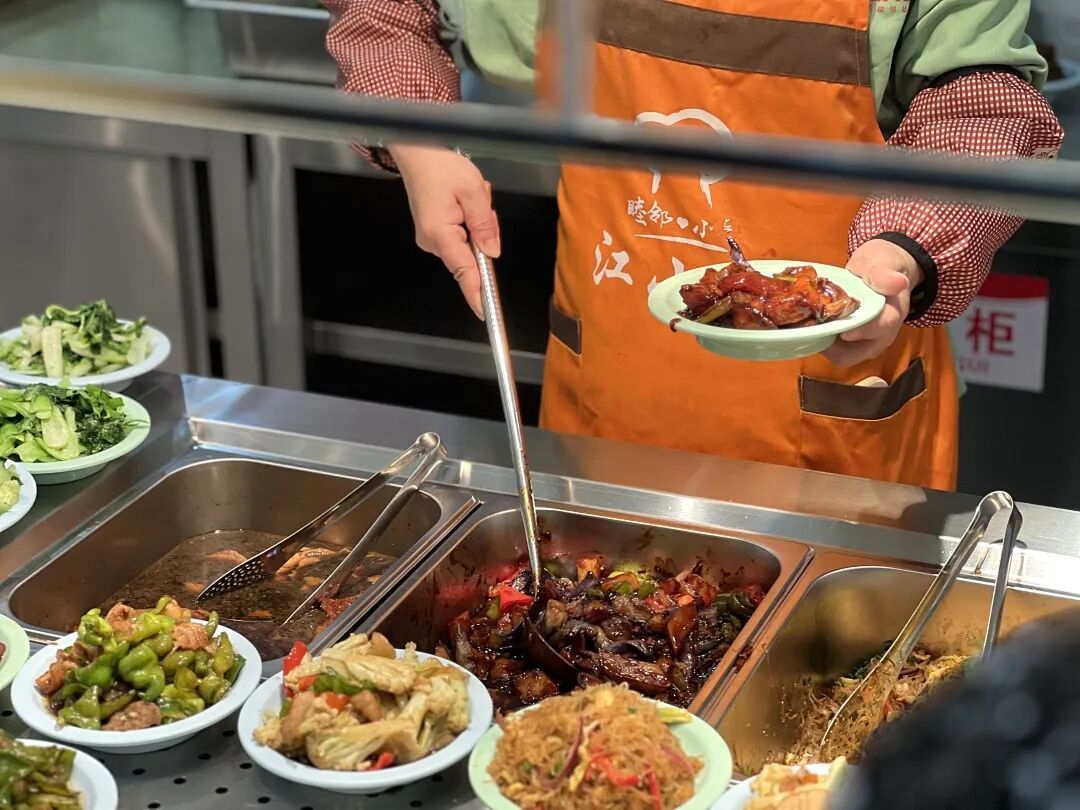 “我点了一份烂糊肉丝、一份四喜烤麸,味道都不错!因为我牙齿没了,就想吃得清淡点。”80岁的闵阿婆端着餐盘满意地说,“没多少钱,一共十来元。”一旁的孔阿姨今天特地点了两个素菜尝尝鲜:“色香味俱全,尤其是这份粉条,是家里烧不出的味道。”