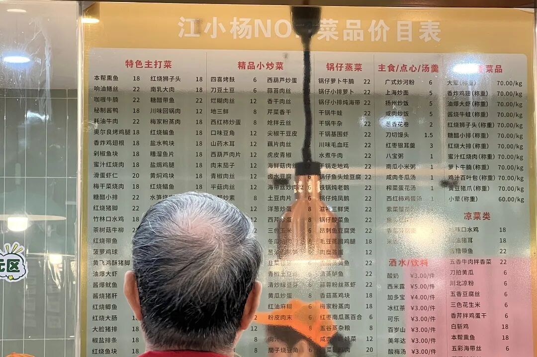 走进宽敞明亮的食堂,选菜区里冷菜、热炒、锅仔等近50种菜品整齐排开。玻璃窗上贴着“6元区”“12元区”“18元区”三个价格区间,什么菜什么价一目了然。不少老年人点上一荤一素,加上老年卡每餐1元的民政补贴,20元左右就能吃一顿热腾腾、香喷喷的午餐。