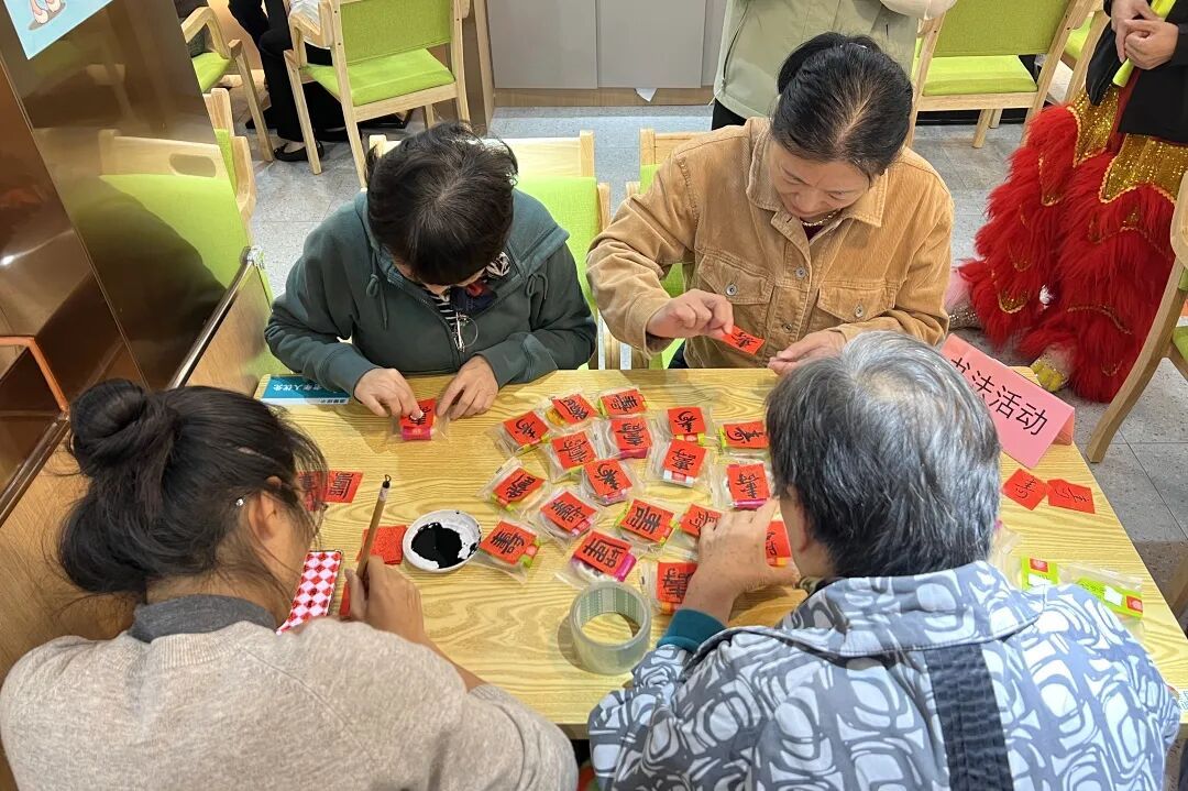 书法活动专区洋溢着浓厚的传统文化气息。书法爱好者们挥毫泼墨,一笔一划写下一个个苍劲有力的“寿”字。工作人员将这些“寿”字精心贴在点心上,然后将这份带着深深祝福的点心送到社区老年人、优抚对象和退役军人手中。