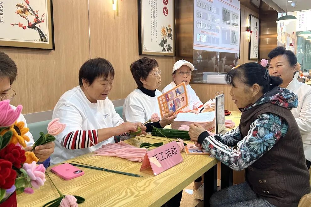 手工活动专区则充满了温馨与创意。认知障碍老人在工作人员的指导下,现场制作扭扭棒花束。这些色彩鲜艳、造型可爱的花束,不仅是老人们用心制作的作品,还被当作礼物送给了现场的居民,增进了社区成员间的互动与情感连接。