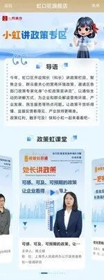 “小虹讲政策” 专区精准破解企业政策理解难题,采用 “专家解读 + 配套服务” 模式提升政策落地效率。专区邀请区直部门局长、科长等专家担任 “小虹宣讲员”,以短视频形式解读营商环境等热点内容;同时配套提供政策原文、办事直通车入口及营商服务 “工具箱”,企业登录上海 “一网通办” 官网,进入虹口企业专属空间即可体验,实现政策服务 “一键直达”。