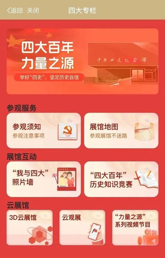 “四大百年”全景呈现中共四大纪念馆红色资源,设 “参观服务”“展馆互动”“云展馆” 三大板块。其中,“参观服务” 板块内置参观须知、展馆地图,为线下出行提供清晰指引;“展馆互动” 板块包含知识竞赛、照片墙,丰富红色文化学习形式;“云展馆” 板块支持 3D 沉浸式漫游与线上观展,以及《力量之源》视频节目,打破实地参观的时空限制。