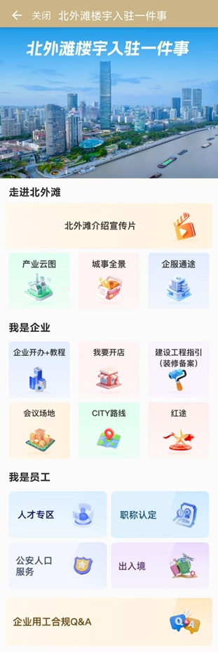 北外滩“楼宇入驻一件事” 整合多平台服务资源,从企业、员工双维度提供精准支持。应用提供区域宣传片、产业云图等。面向企业,整合企业开办、楼宇装修等办事指引,助力企业快速了解产业布局、挖掘合作机遇,保障运营顺畅;面向员工,应用设置人才专区,提供用工合规问答(Q&A),在降低企业用工成本的同时,有效提升员工归属感。