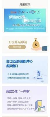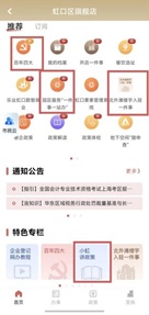 也可以登录“随申办”企业云APP后,点击“区域”,选择“虹口旗舰店”点击进入主页,在推荐与特色专栏点击即达。