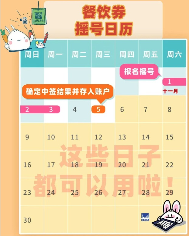 市商务委10月27日消息,“乐品上海”餐饮消费券继续采用“在线报名、摇号中签”方式发放,本批消费者报名领券时间为11月1日-11月3日,摇号中签结果于11月5日24点前确定并存入相应的平台App或小程序账户中。本批发放的餐饮消费券自11月6日起核销使用,有效期至11月30日。