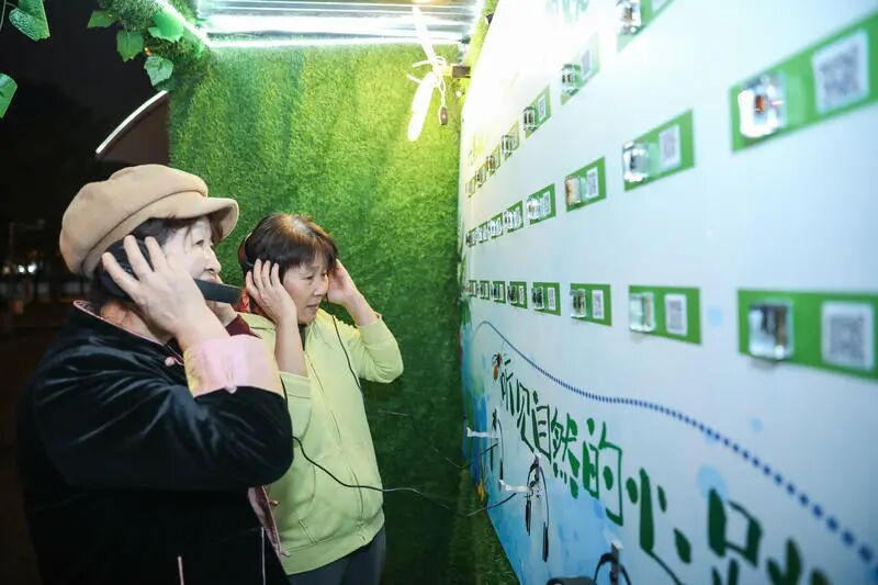 在随后“听见自然的心跳”首场互动体验上,市民佩戴耳机即可听到蝉鸣、鸟叫、风拂树叶等真实声景,现场还展示了很多昆虫标本,并配有简短讲解,让一些小朋友开心不已。