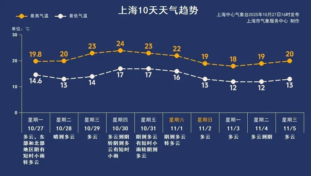 短暂降雨之后,双休日天气转好。冷空气补充影响下,最高气温跌向1字头,早晚秋凉也是来真的,市区最低跌至12℃上下,郊区更低。