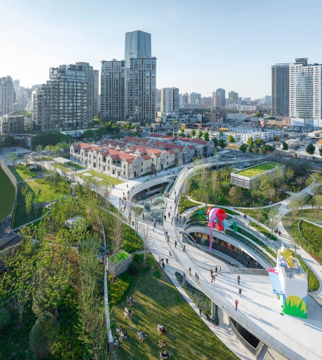依托慎余里历史街区与天后宫文保建筑,以古建新生的方式重塑文化记忆;以4.2万平方米城市绿地公园为底色,形成“城市峡谷”与“滨水花园”共融的生态景观;以“海派文化+宠物友好+夜经济”三大特色场景,塑造年轻客群的情感认同与社交标签。