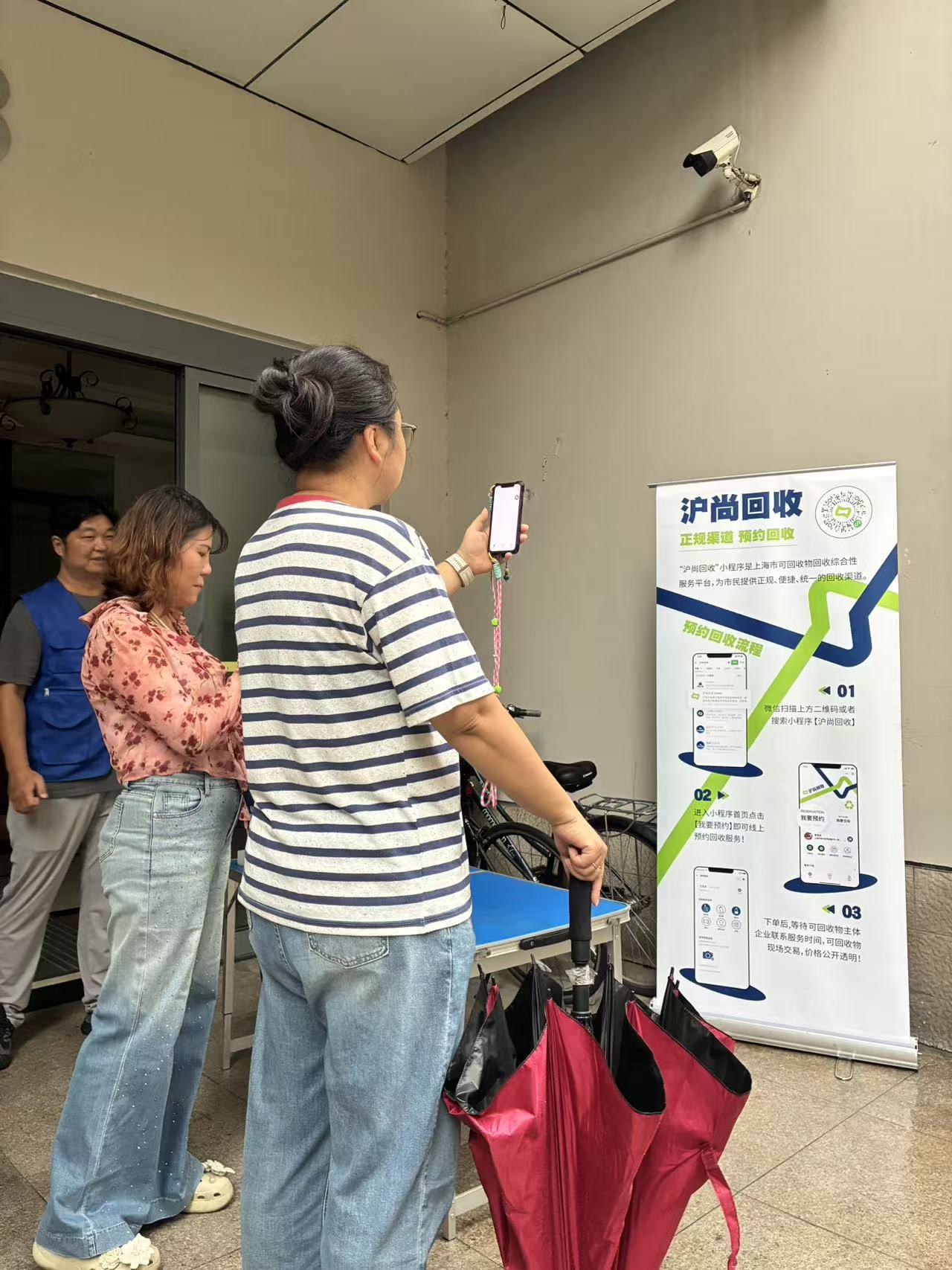 活动现场,城运中心组织党员志愿者、网格员在“沪尚回收”便民回收摊位前主动服务。工作人员通过展示宣传展板、发放手册等方式,向居民详细介绍“沪尚回收”线上预约、上门回收流程,重点推广废纸张、废金属、旧衣物等可回收物的规范投放与回收渠道。同时,现场提供免费回收服务,引导居民将家中闲置物品分类投放,有效强化了“沪尚回收”品牌的社区曝光度与居民认知度。
