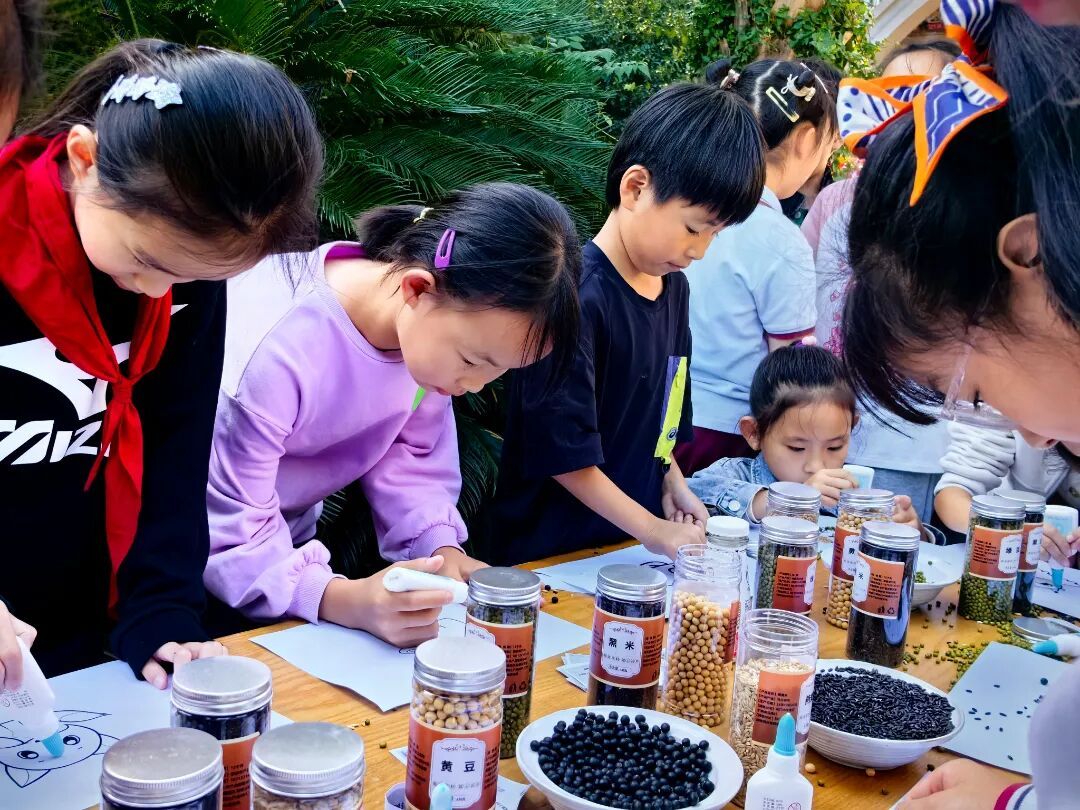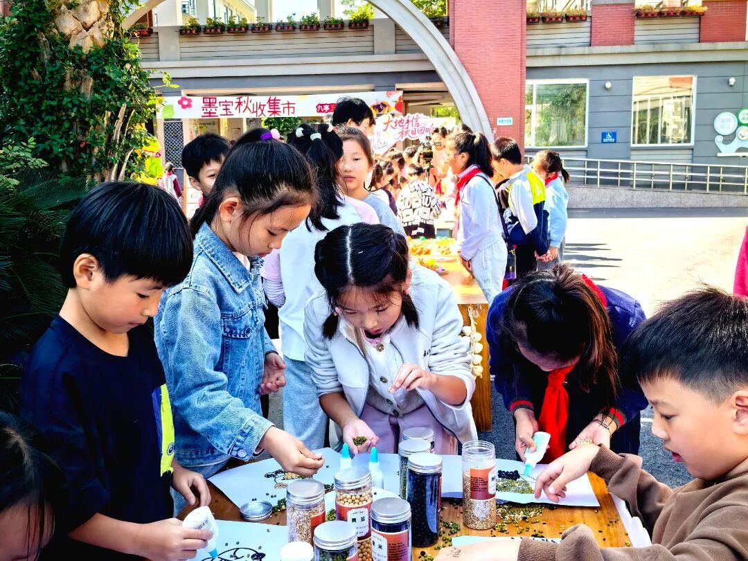 午间休息时段,孩子们成群结队入场。刚从树上摘下的橘子最受欢迎,嘴馋的孩子迫不及待地想要品尝。除了品鉴丰收的果实,这里的集市也是趣味课堂,心灵手巧的孩子们在老师的指导下,争先恐后尝试制作拓印帆布包、种子粘贴画等。五(5)班学生林佳涵说:“不光好玩,还能长知识。比如,在收集种子的过程中,老师会和我们一起探究,弄清楚种子的品类,如何种植等等。”