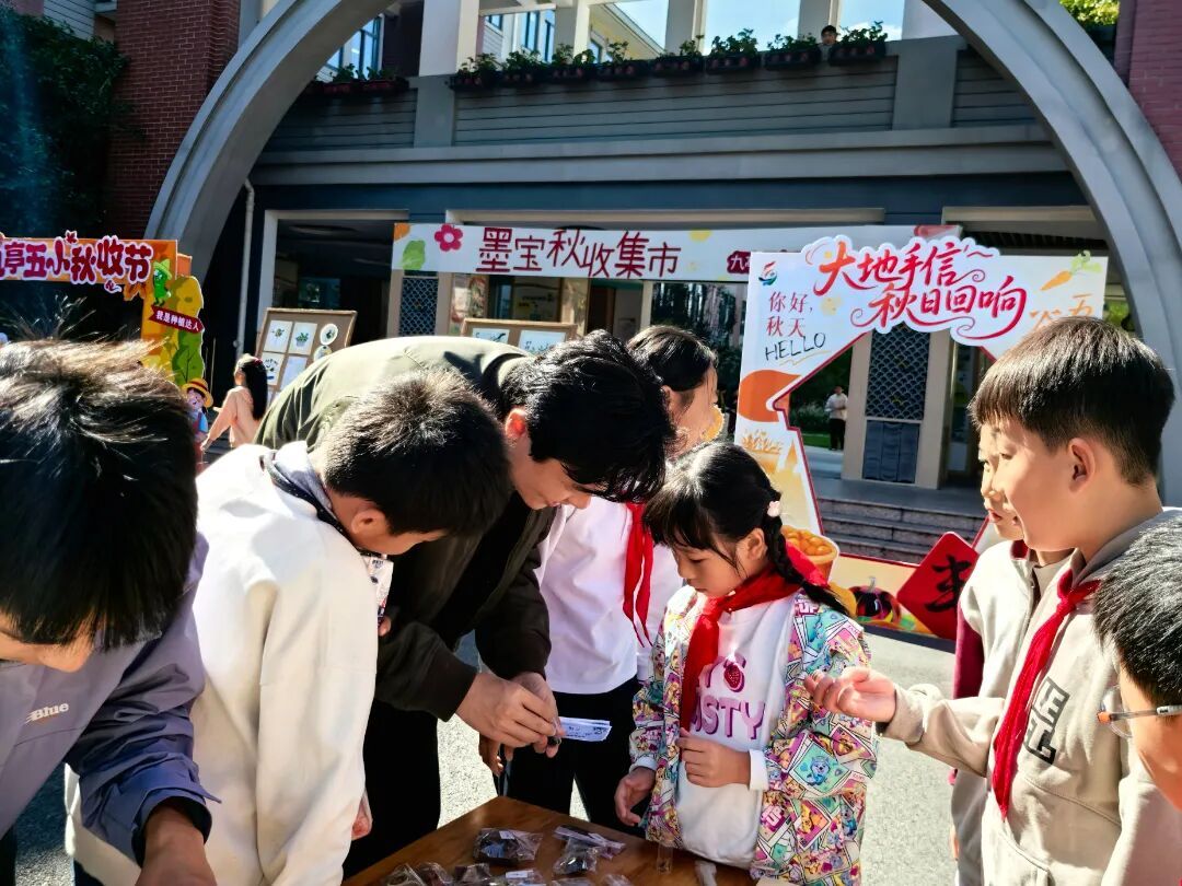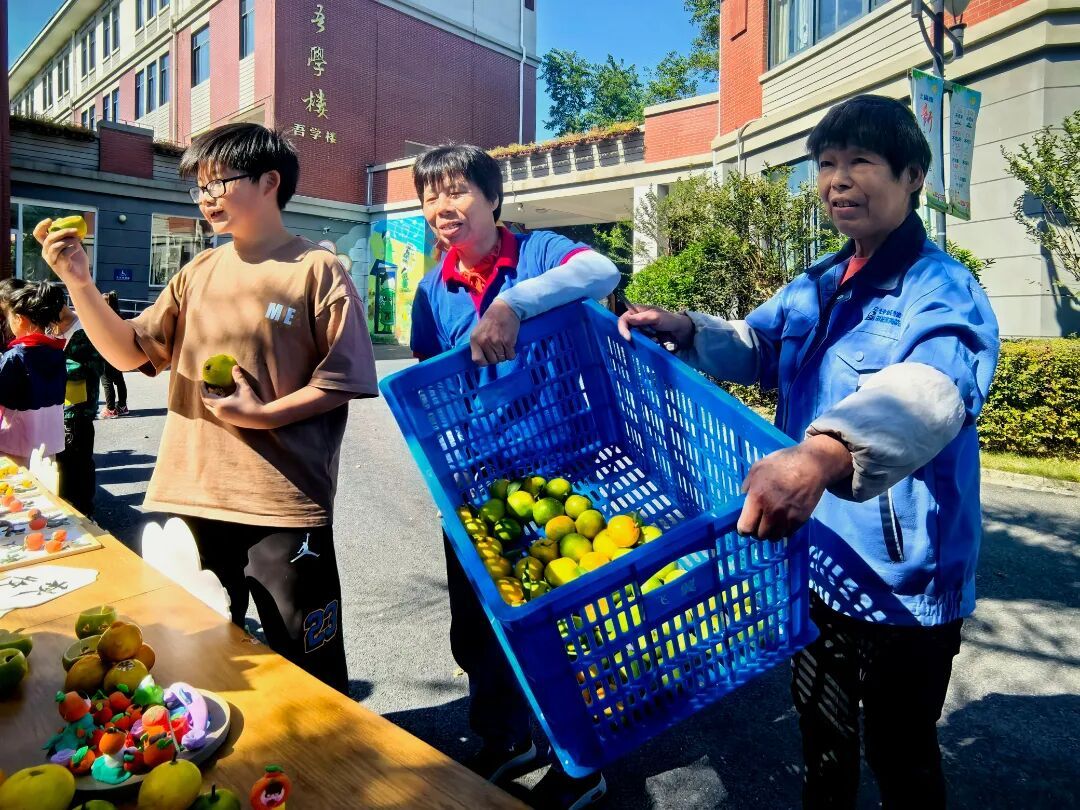 当天,校园里一派秋收好景象,南瓜、橘子、柿子等校园农场自产农作物品类被摆上“五谷丰登”展示台,种子画、落叶书签、树叶拓印、秋日相框等摊位也在集市上支了起来。老师们组队出摊,还在集市上展出以秋收为主题的书法、绘画作品及作文。