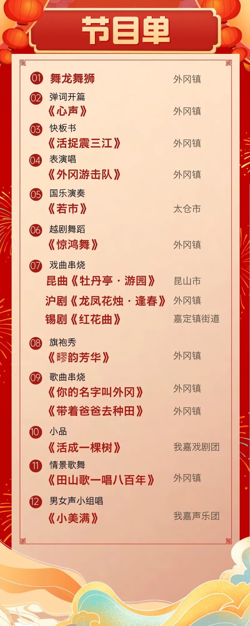 这场充满农趣农味、独具乡村本色的秋季“村晚”,将以“红色记忆·星火冈湾”“古韵新潮·艺述冈申”“海派江南·和美嘉音”三大篇章为主线,融合舞龙舞狮、传统戏曲、现代歌舞等多种艺术形式。既有展现新时代乡村振兴生动实践与丰硕成果的内容,又聚焦于质朴的邻里温情与鲜活的生活故事,让人在熟悉的烟火气中,感受外冈乡村的文化活力与独特韵味。