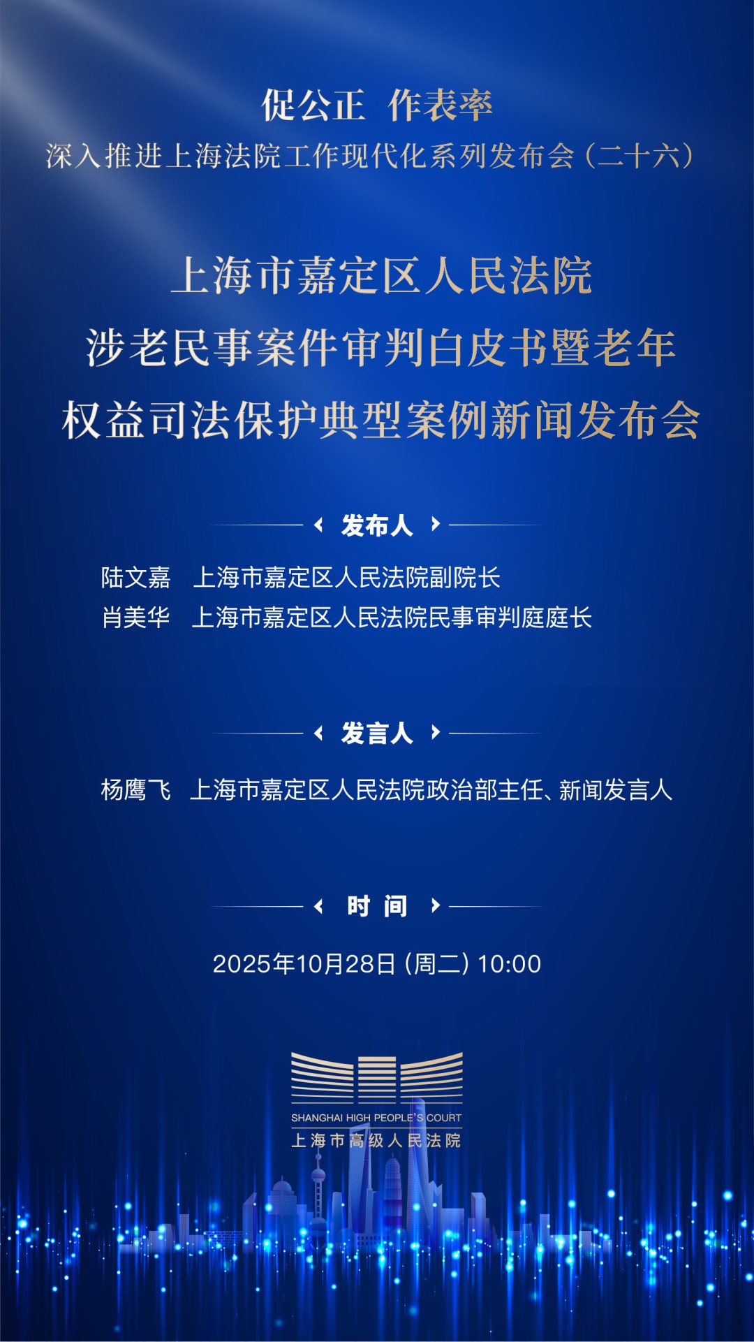 为贯彻落实积极应对人口老龄化国家战略,集中展现法院在涉老审判中的实践成果,精准回应老年人权益保护的社会关切,营造全社会关心关爱老年人、共建共享老年友好型社会的良好氛围,在中华民族传统节日重阳节来临之际,今天(10月28日)上午,上海市嘉定区人民法院(以下简称嘉定区人民法院)召开涉老民事案件审判白皮书暨老年权益司法保护典型案例新闻发布会,发布2022年至2025年9月涉老民事案件审判情况,通报并解读10起老年权益司法保护典型案例。