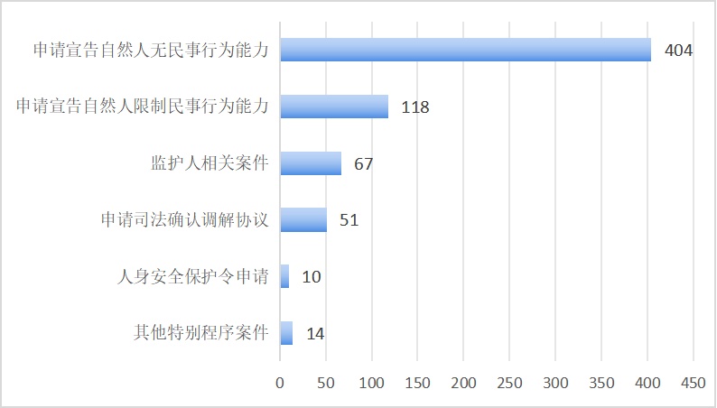 5. 特别程序案件:申请宣告自然人无/限制民事行为能力案件与相关监护权特别程序案件占比近90%。传统家庭监护模式仍处于主导地位,然而人民群众的客观需求也催生出意定监护、社会监护、遗嘱指定监护等多种新型监护模式。在涉老特别程序案件中,还存在一定数量的人身安全保护令申请案件。