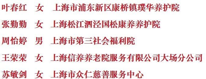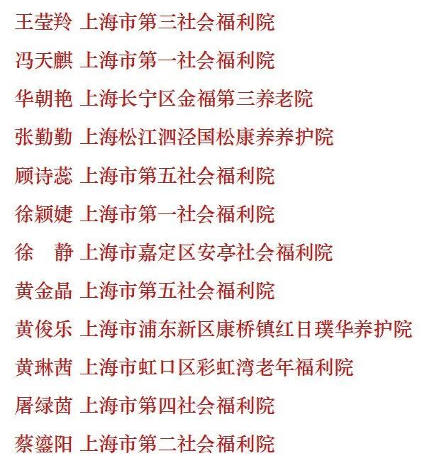 一等奖 季 旭 上海市第一社会福利院 二等奖 王伟楠 上海市第四社会福利院 三等奖 何俊荣 上海市杨浦区社会福利院 优胜奖 (按照姓氏笔画排序)