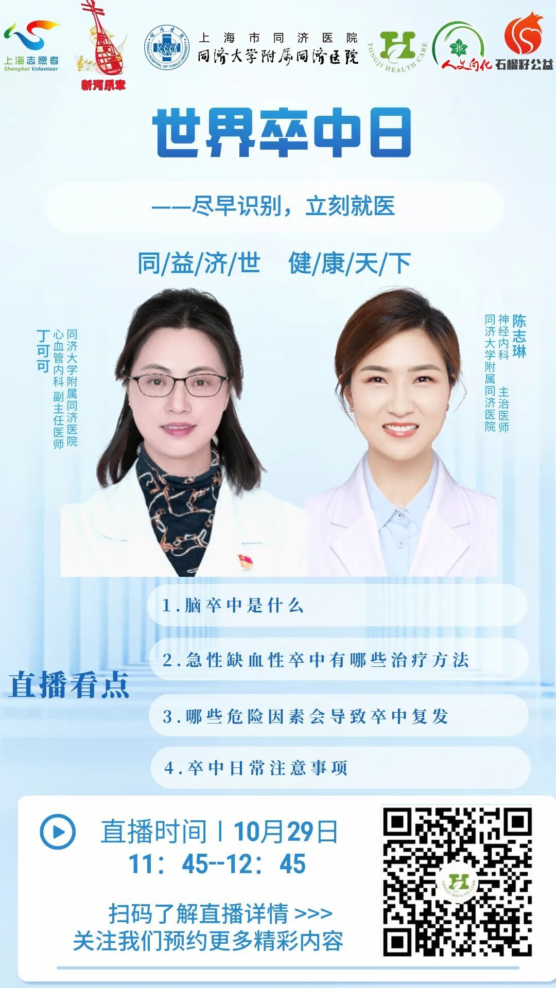 寒露已过,气温渐寒,心脑血管疾病进入高发期,脑卒中(即“中风”)的突发风险也随之上升。及时识别卒中信号、掌握科学应对知识,是守护生命健康的关键。值10月29日“世界卒中日”来临之际,由上海市志愿者协会指导,同济大学附属同济医院、上海市崇明区向化镇人民政府、上海市崇明区新河镇人民政府主办,同济医院体检与健康管理医学中心、神经内科、社工部、上海崇明石榴籽公益发展中心联合承办的“世界卒中日”主题直播即将开启!