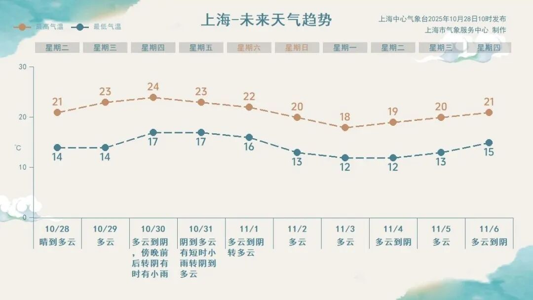 上海中心气象台预计,明天延续晴好天气,日最高气温或将达到23℃,昼夜温差将会接近10℃。周四白天天气以多云到阴为主,最高气温在24℃左右,傍晚前后转为阴有时有小雨的天气。周五受弱冷空气影响,小雨渐止,气温逐渐下滑。双休日天气转好,但受冷空气补充影响,气温将会继续下降。下周初,全天气温再度跌至20℃以下。未来十天气温先升后降,略有起伏,早晚和冷空气影响时注意适当添衣。