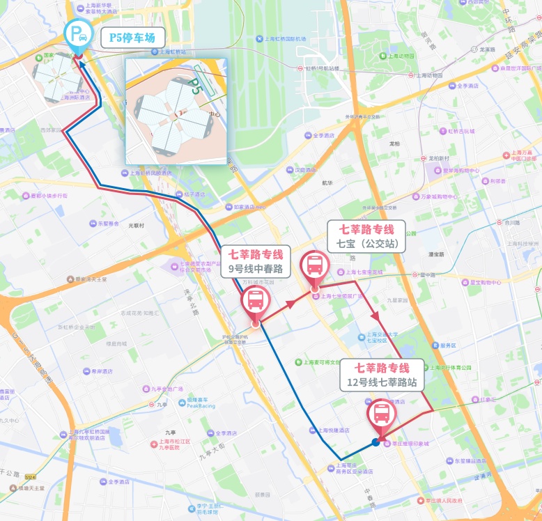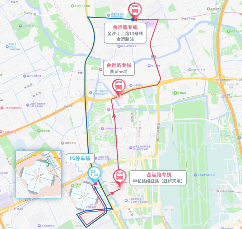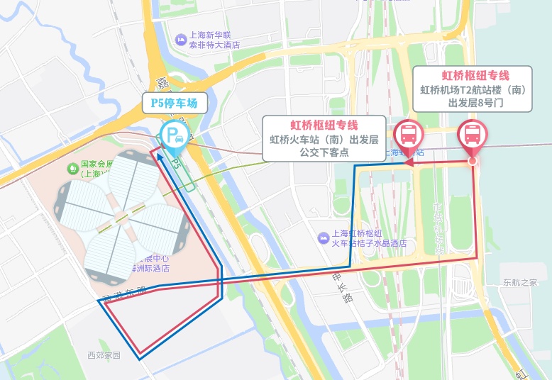 展会期间,在P5停车场内设置4条进博会接驳专线,分别开往虹桥机场T2航站楼、虹桥火车站;轨道交通9号线中春路站、七宝公交站、轨道交通12号线七莘路站;轨道交通13号线金运路站;以上三条线路在离场时段(15时至20时)运行。另一条开往徐泾镇全日(8时至20时)运行。