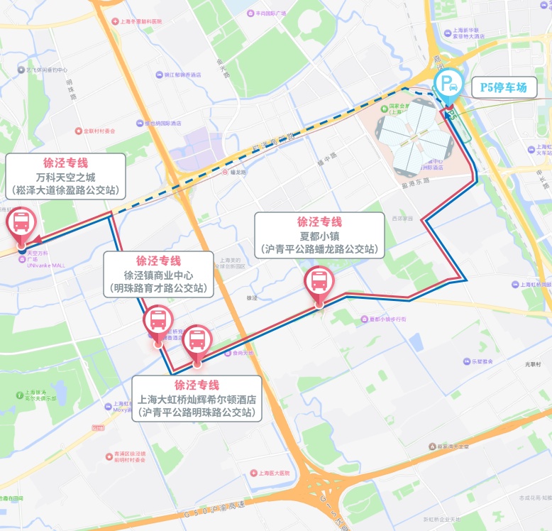 徐泾镇商业中心(明珠路育才路公交站)、上海大虹桥灿辉希尔顿酒店(沪青平公路明珠路公交站)、夏都小镇(沪青平公路蟠龙路公交站)、P5停车场