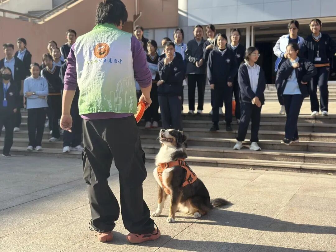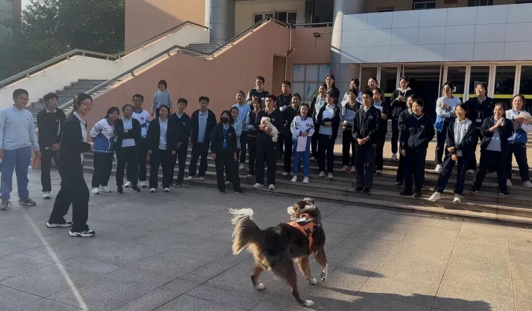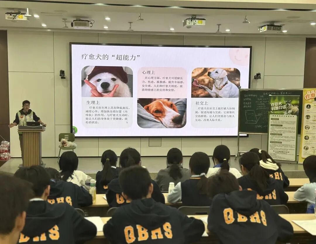“训犬师不仅是教狗狗‘坐下’‘握手’的人,而是要在了解心理学、动物行为学等基础上,搭建起人与犬之间信任的桥梁。”疗愈犬引导员朱建华通过图片与视频,向学生们揭示了疗愈犬如何走进医院、特殊教育机构,为需要帮助的人们带去慰藉,同时也让学生初步了解了家庭犬训练师、疗愈犬训练与评估师、特种工作犬训练师等新兴职业。