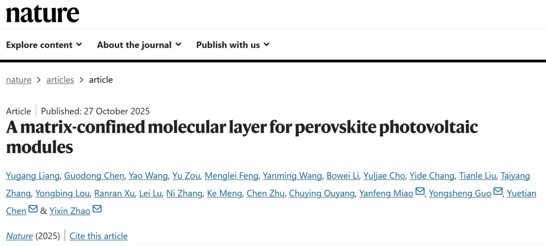近日,《Nature》在线发表了上海交通大学环境科学与工程学院赵一新教授团队题为“A matrix-confined molecular layer for perovskite photovoltaic modules”的研究论文。