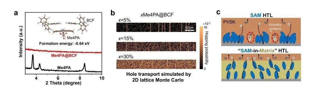 针对上述挑战,赵一新团队提出了一种“基质限域分子层”型空穴传输层结构的新思路,利用具有强吸电子能力与优异化学稳定性的三(五氟苯基)硼烷(BCF)分子构建主体骨架,将空穴传输分子分散于BCF基质中,形成类似于“枣糕结构”的传输层。该结构首先容易形成厚度可控的空穴传输覆盖层,密度泛函计算揭示BCF骨架分子与空穴传输分子间的强相互作用有效抑制了SAM结构中空穴传输分子的堆叠倾向与聚集行为。二维蒙特卡洛模拟指出,在该厚度可调的分子层结构中,少量空穴传输分子即可实现和理想无堆叠SAM一样的高效空穴传输。该基质限域分子层-钙钛矿层界面还兼具良好的化学稳定性与较低的界面复合损失。“基质限域分子层”型空穴传输层更体现了优异的浸润性,其致密的埋底界面保形覆盖能显著提升大面积薄膜的结晶质量与均匀性。