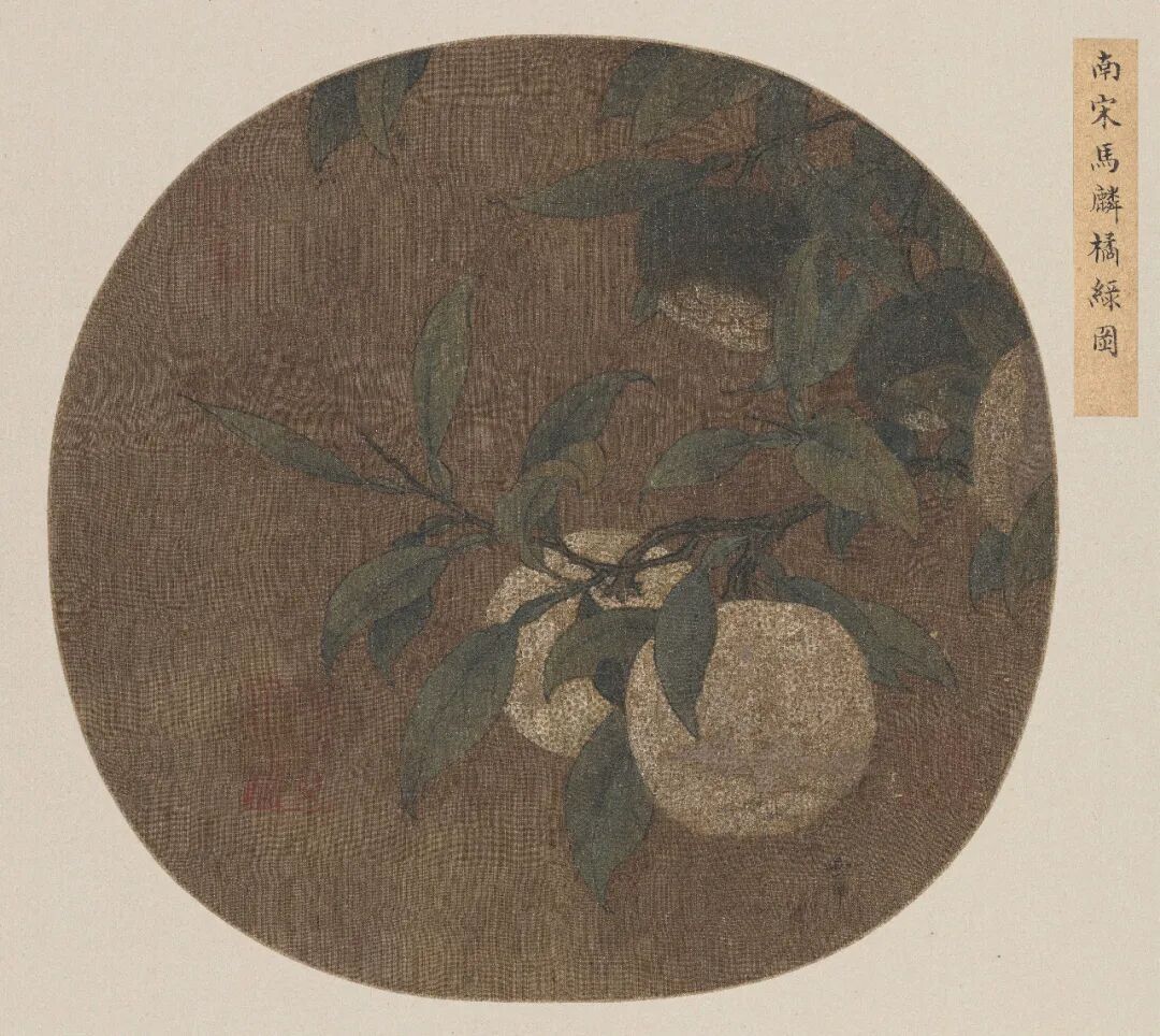 赵令穰的《橙黄橘绿图》描绘了水畔的橘林美景,而马麟的《橘绿图》则聚焦于橘枝的局部,是对枝头橘子的特写。马麟为南宋著名画家,钱塘(今浙江杭州)人,出身于绘画世家,任职于南宋画院。本幅画作中,橘子由绿转黄,圧满枝头。画家以粗细匀称的线条勾勒出橘树的叶片,并以黄绿色涂满橘叶,叶片的正、侧、反、转、挺立、下垂等诸多不同姿态让画面充满生机和活力。