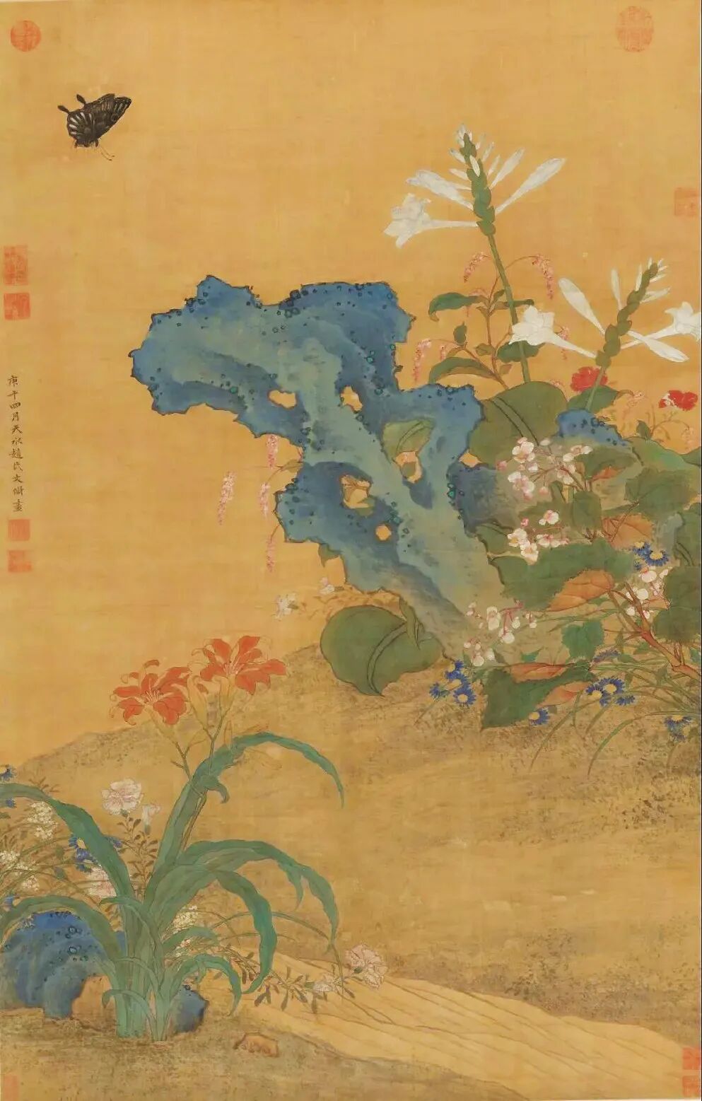 狭窄的溪流两侧鲜花盛开,色彩鲜艳,有蓝色的雏菊、粉嫩的竹节海棠、橘色的萱草、白色的玉簪、粉白的红蓼、艳红的石竹以及其他诸种草花。挺拔嶙峋的太湖石立于花草之间,既丰富了画面内容,增添画面层次,又调和了画面色彩。画面左上方,一只黑色蝴蝶被繁花吸引而来,正扇动翅膀,缓缓落下。