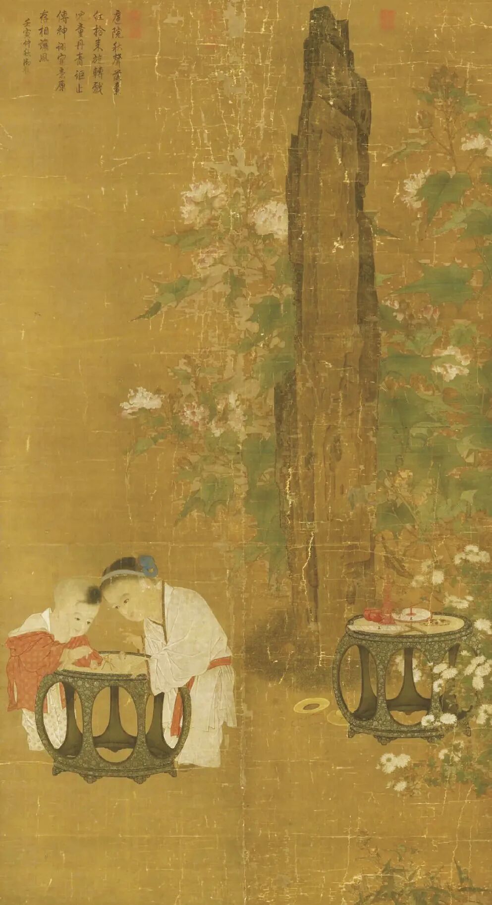 画面右侧,画家精心地描绘了秋日鲜花盛开的庭院场景。一丛芙蓉花花朵硕大,花色粉嫩。芙蓉花丛中一块柱状的山石昂然挺立,直插向上,气势凌人。画面右下方,几株雏菊花朵繁茂,花色素雅洁白,花丛中掩映着一件精美的螺钿漆墩,上面放着八宝纹纸格、转轮和玳瑁盘、小佛塔、宝塔棋盒等精致昂贵的儿童玩具,草地上还放着一个小铙钹。