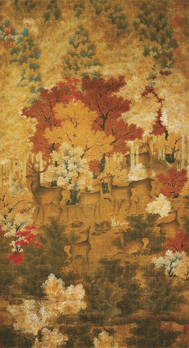 五代时期辽代的一位画家曾创作出绢本重彩画作《丹枫呦鹿图》,这幅画是描绘秋色的名作。此画描绘的是群鹿游憩于彩叶绚烂的秋林中的场景,群鹿造型生动,呼朋引伴,颇具情趣。