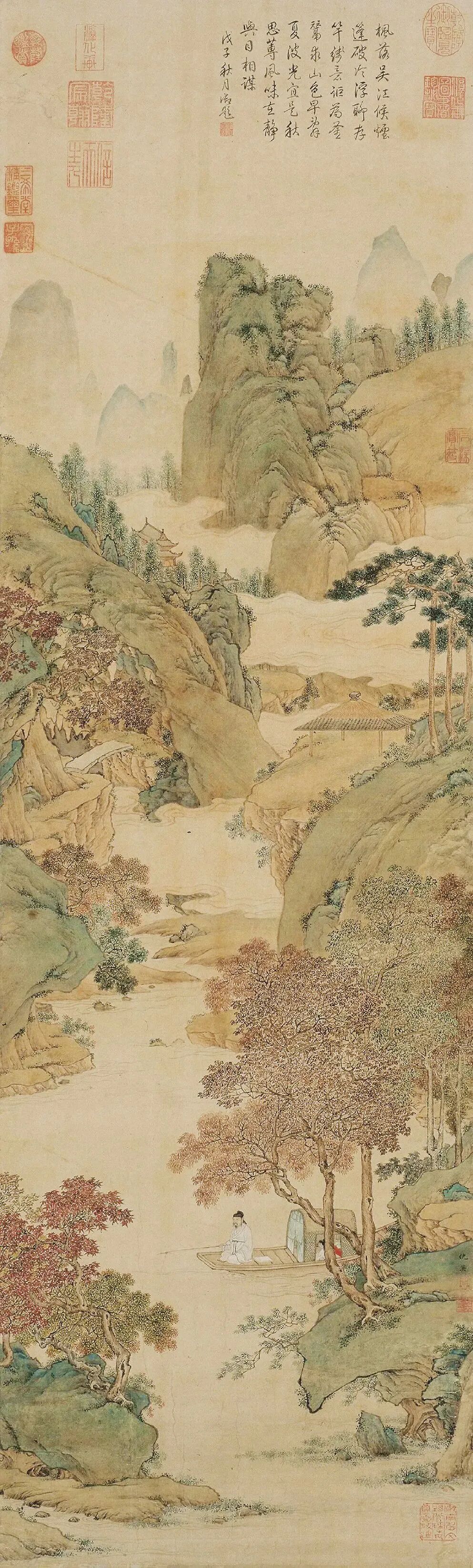 在这大美秋光中,有人于室内读书品茶,有人在庭院中赏花嬉戏,也有人走向野外,感受山水林木间的多彩秀色。明代画家仇英绘有《枫溪垂钓图》,描绘的就是高士在斑斓秋色中于水畔钓鱼的场景。