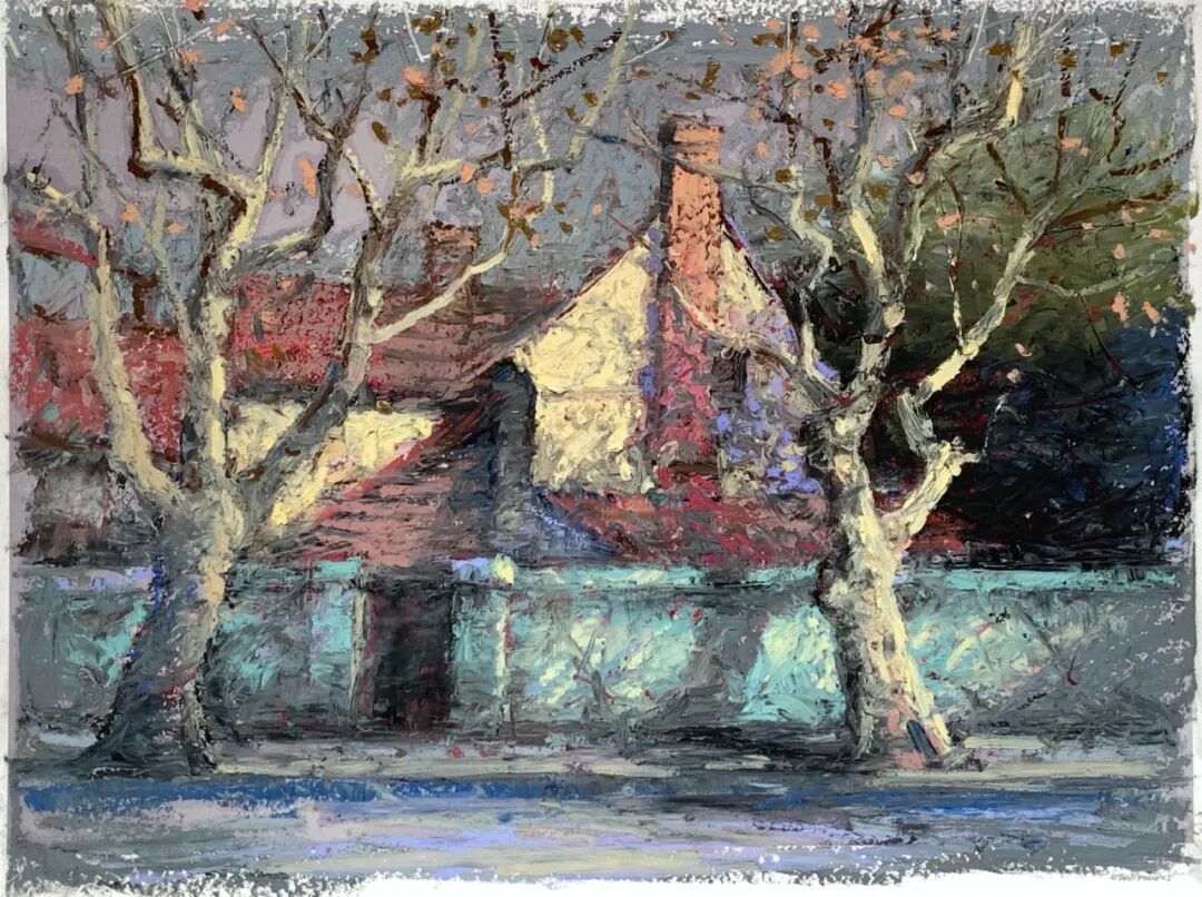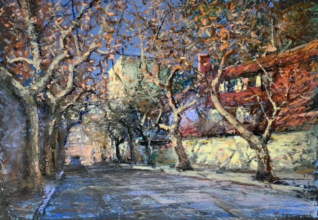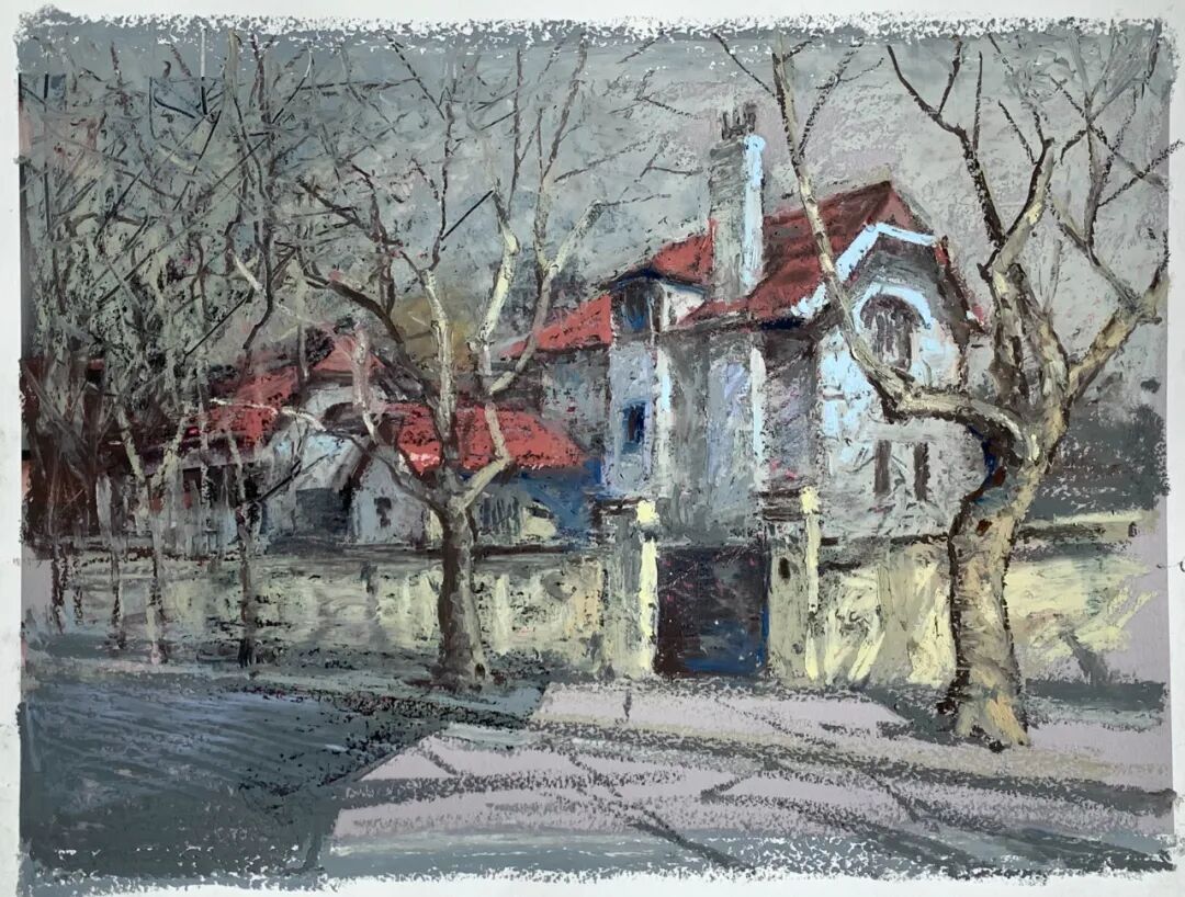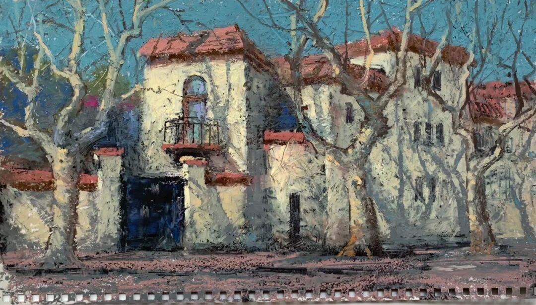 有一年秋天的一个午后,我偶然来到衡复街区,被午后阳光照射下的历史文化名人街区的建筑深深吸引,武康路、高安路、湖南路等多条马路,狭窄的街道两旁依然是风情万种的梧桐树掩映着一幢幢老洋房,还有藏着时光印记的老弄堂,以前也多次去过这个地区,但这次感觉不一样,有一种老建筑重获新生感,有一种想画的冲动。于是,后来陆陆续续去了几次,用油画棒一一记录下来。