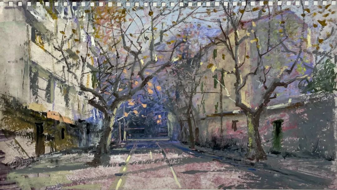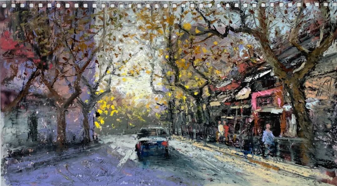 答:梧桐树、永不拓宽的马路、名人故居和历史保护建筑这些都构成了上海有别于其他城市的独特标识,历史文化风貌区和优秀历史建筑承载着城市记忆、传承着城市文脉,是极为珍贵的历史文化资源,也是城市软实力的重要组成部分,采用比较熟悉的油画棒来表现对象,应用记实色彩加主观色彩,使画面色彩更加丰富,技法上采用刀刮法和点彩法相结合,呈现这些有上海特色的马路、老洋房也是非常有意义的事。