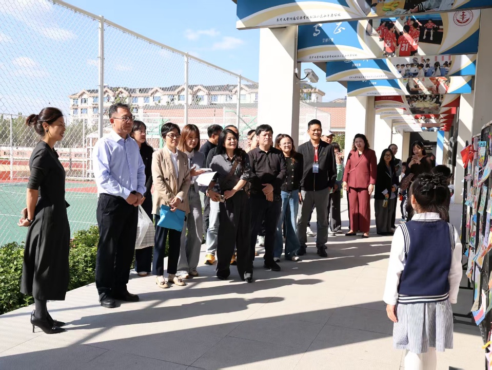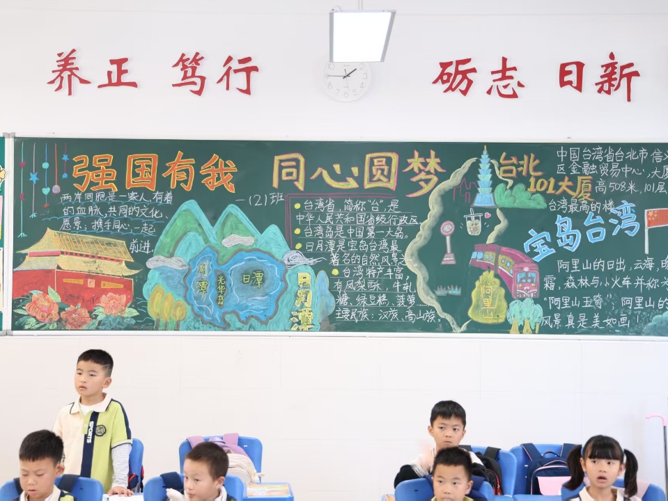 活动前,与会领导依次参观了校园红色图书角、主题展板及各班黑板报。红色图书角陈列经典著作,电子屏动态播放学校爱国主义教育活动精彩掠影;主题展板集中展示学生以“两岸一家亲,共筑中国梦”为主题的涉台小报,学子们发挥想象力与创造力,以作品勾勒童真童趣的团圆期盼;环境营造上,师生共同研讨黑板报主题,教师精心绘制呈现,把两岸同源的历史脉络与共通文化基因融入校园场景,让师生在日常中潜移默化接受熏陶。三大展区共同营造出浓厚的涉台教育氛围,使师生在浸润中深化对国家统一大义的理解与认同。
