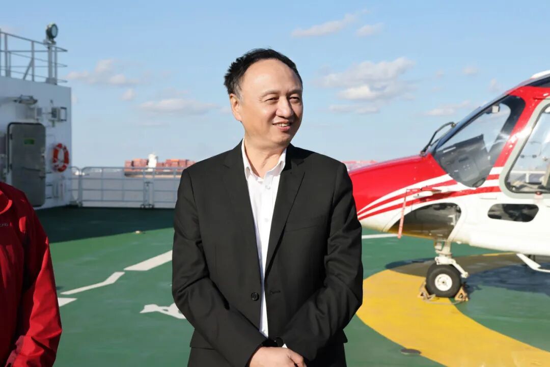 最后,师生代表们登上了直升机起降平台,一览中国极地考察直升机的风貌。马克思主义学院25级本科生、班级团支部书记陶闵逸发表感言说:正是这堂“行走的书记双师课”给予了同学们如此难得的机会,在“雪龙2号”前往南极开展第42次科考前,有幸来到基地进行参观,让原本停留在新闻报道中的印象通过实地考察的方式具象化,让同学们更加坚定志向,以自身的满腔热忱投入到实现中华民族伟大复兴的重任之中。许涛书记最后总结:在深入学习贯彻党的二十届四中全会精神之际,我们来到载负盛誉与荣耀的雪龙号科考船参观和进行实践教学,让人倍感振奋,我们既振奋于祖国的科技自立自强的伟大成就,更振奋于在遥远的南极和光荣的极地研究中心,也有我们的校友贡献上财人的智慧和力量,希望各位同学能够汲取这种精神养分,深耕专业、刻苦奉献,践行经济匡时的校训精神,在不久的将来为强国建设、民族复兴做出无愧时代的贡献。